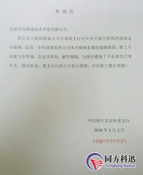 3月2日,中信銀行北京懷柔支行為我公司寄來(lái)一封表?yè)P(yáng)信,對(duì)我公司及工作人員的服務(wù)表示高度贊揚(yáng),并且當(dāng)場(chǎng)熱切表示將我公司作為其空調(diào)維保服務(wù)唯一指定公司!