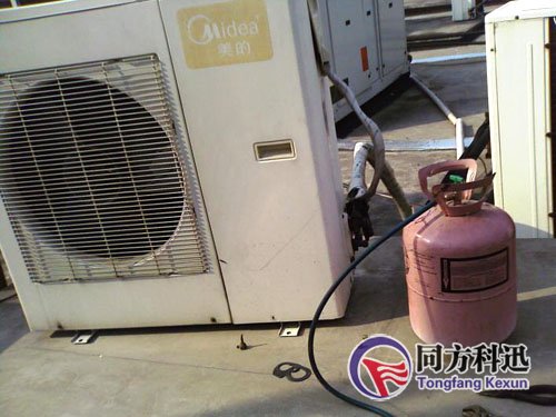 1.定量加氟:在三通截止閥工藝口連接好三通閥、壓力表、加氟軟管、氟瓶或真空泵等。放氟抽真空后,開始慢慢加氟。用臺秤等較精確的計量工具稱重,當(dāng)氟瓶內(nèi)氟的減少量即是空調(diào)銘牌上的尺度加氟量時,封閉氟瓶閥門。