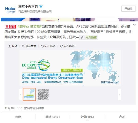 海爾中央空調向社會“眾籌節(jié)博藍”